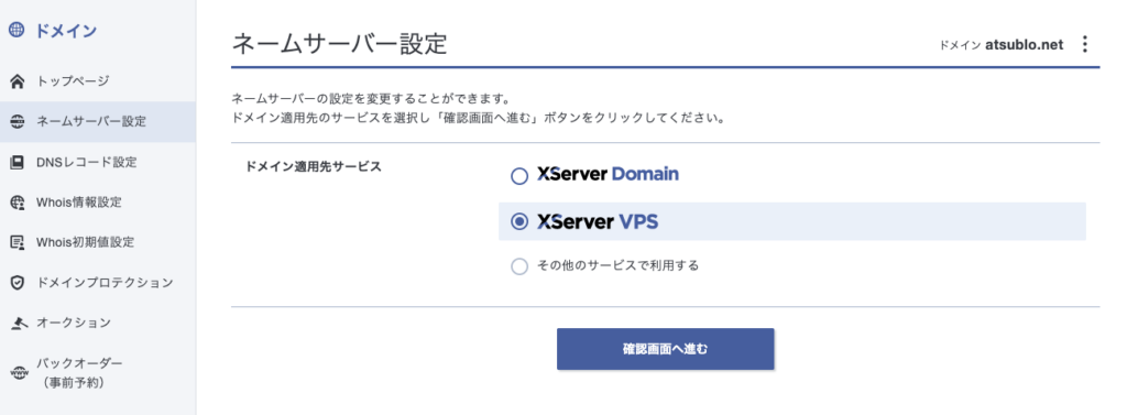 - 注意点:「Xserverドメイン」の連携先は「XserverVPS」に設定し、必ずご自身のVPS管理パネル「DNS設定」欄に表示されている値を優先してください。