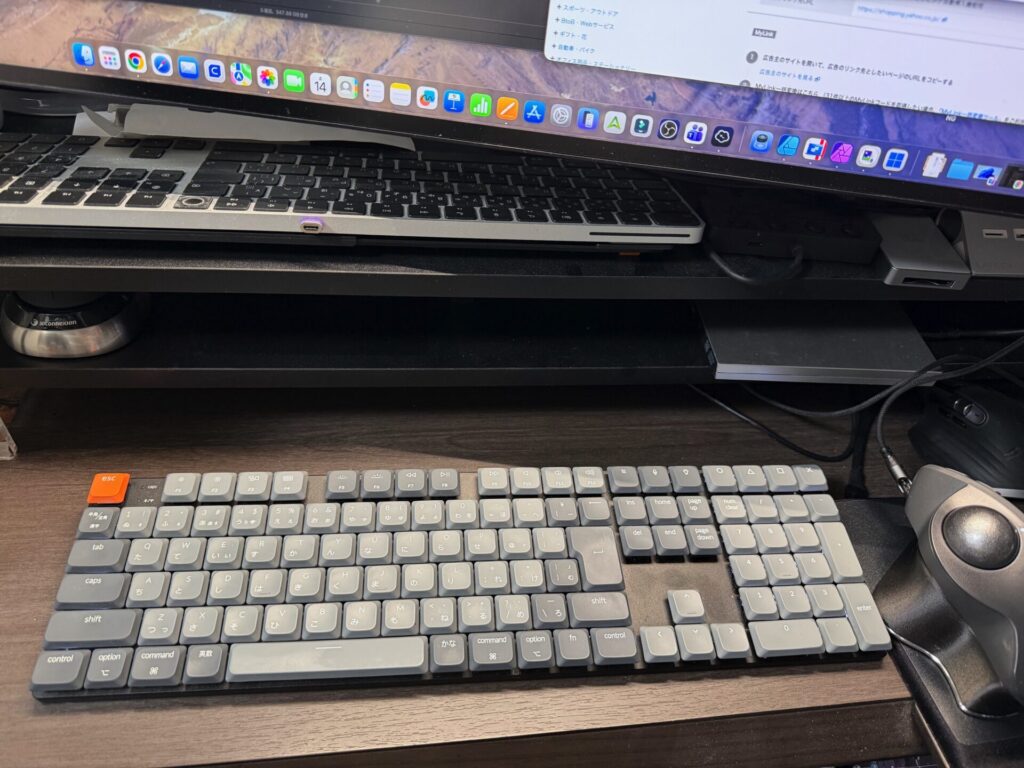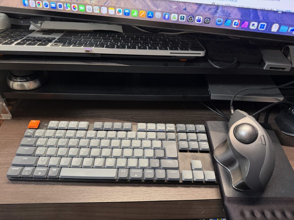 対して自宅はMac環境。ブラウジングや執筆がメインで、テンキーは不要です。 ここでテンキーレス(TKL)の『K1 Max』を導入し、トラックボールを極限まで近づける計画です。