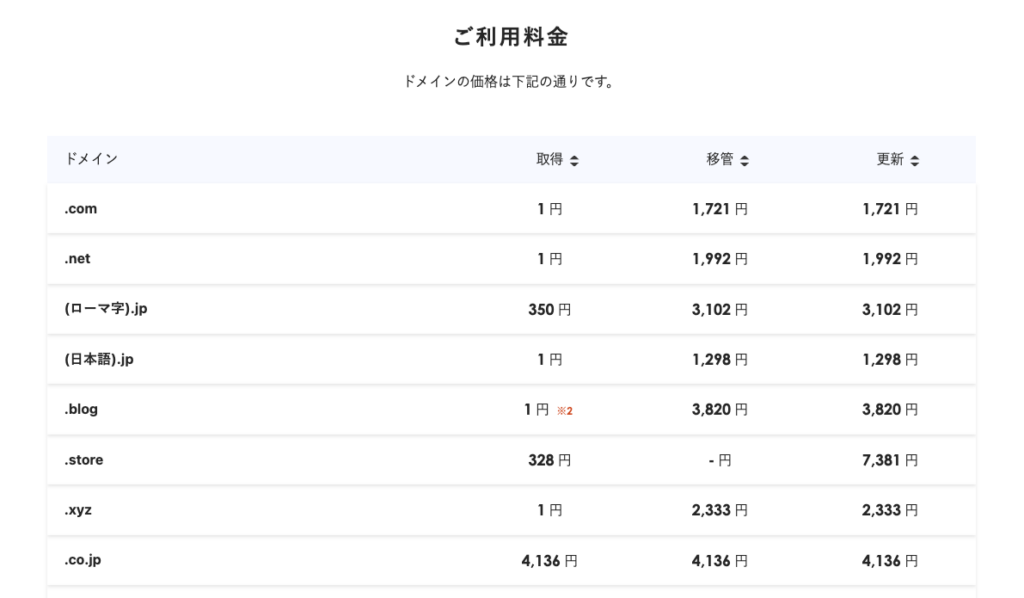 ドメインを選ぶときは更新料も確認しておきましょう。取得時は1円でも1年後にドメインを更新する際に高額請求が発生することがあります。「.com」や「.net」を選択するのが無難ですよ。サーバーとセットで申し込む場合は更新料も無料になるのでとてもお得ですね。
