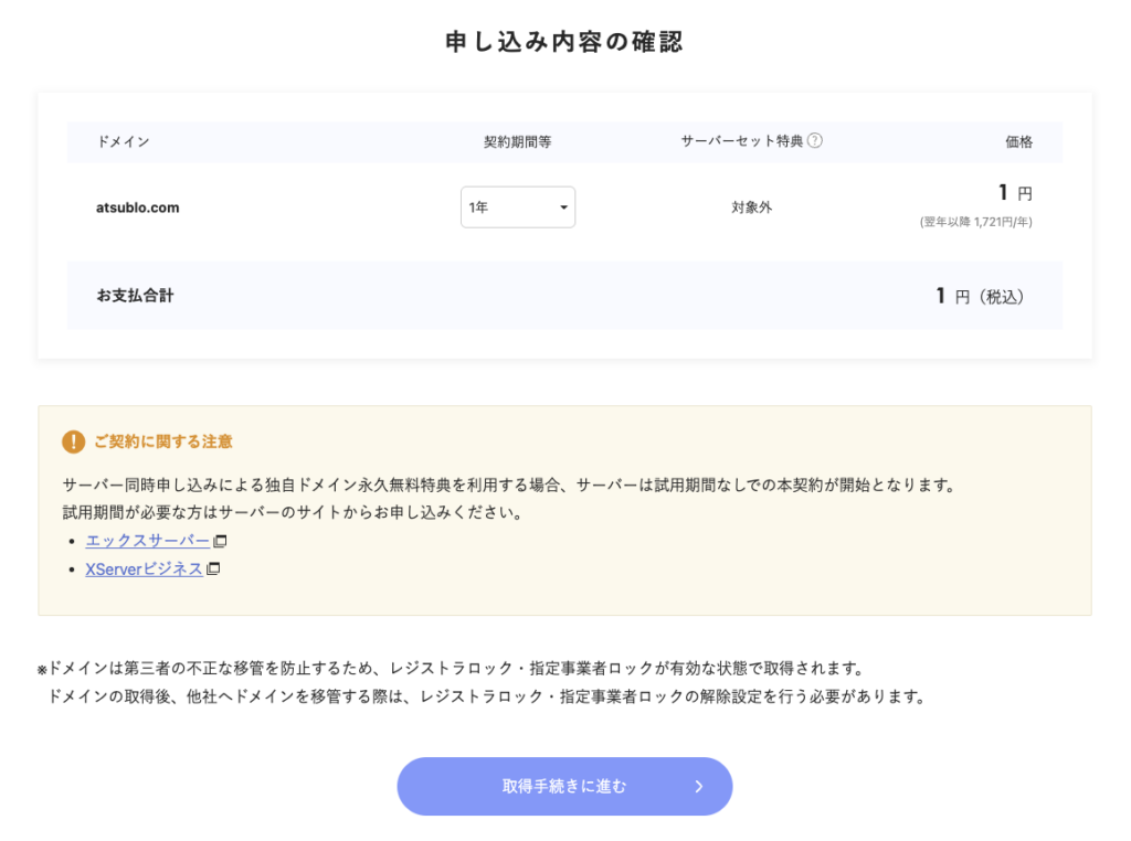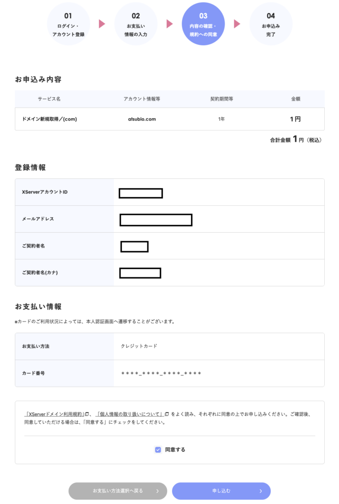 最終確認画面が表示されますので、内容を確認して「同意する」にチェックを入れて「申し込む」を押せばあなただけのドメインをゲットです。