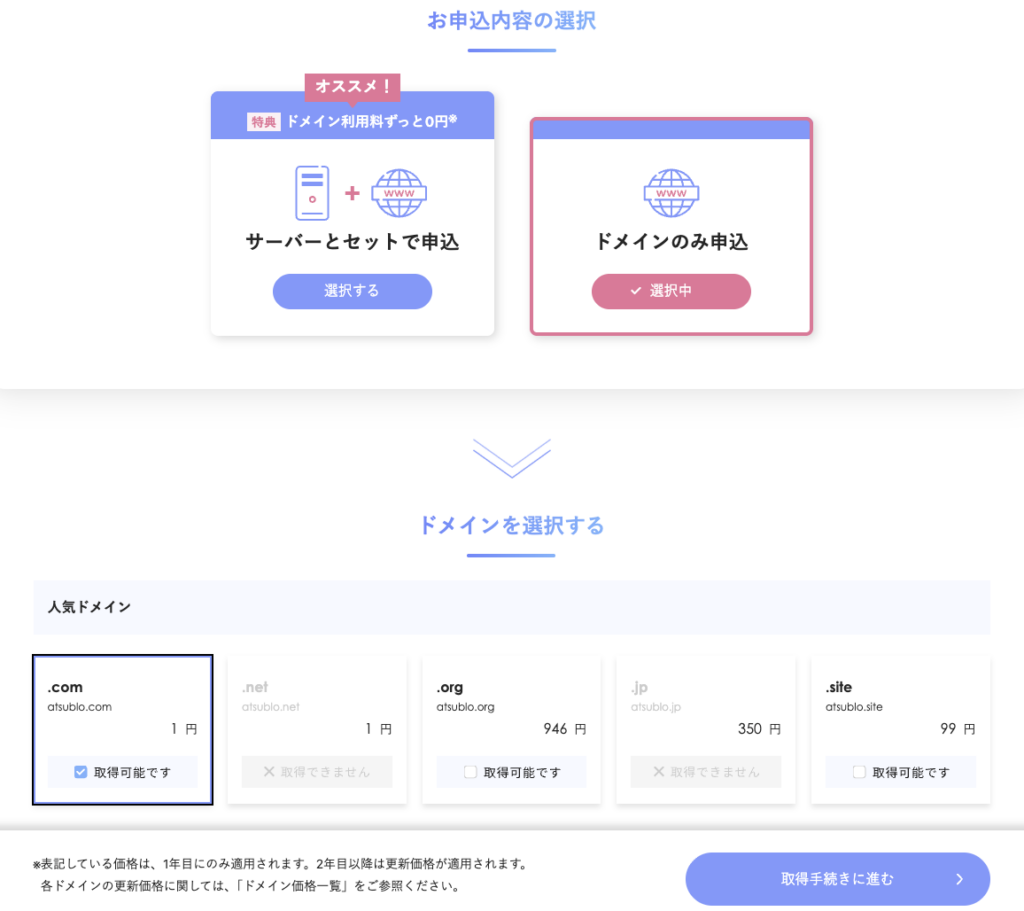 ドメインは「早い者勝ち」です。検索結果に「取得可能です」と表示されればラッキー!そのまま進みましょう。
