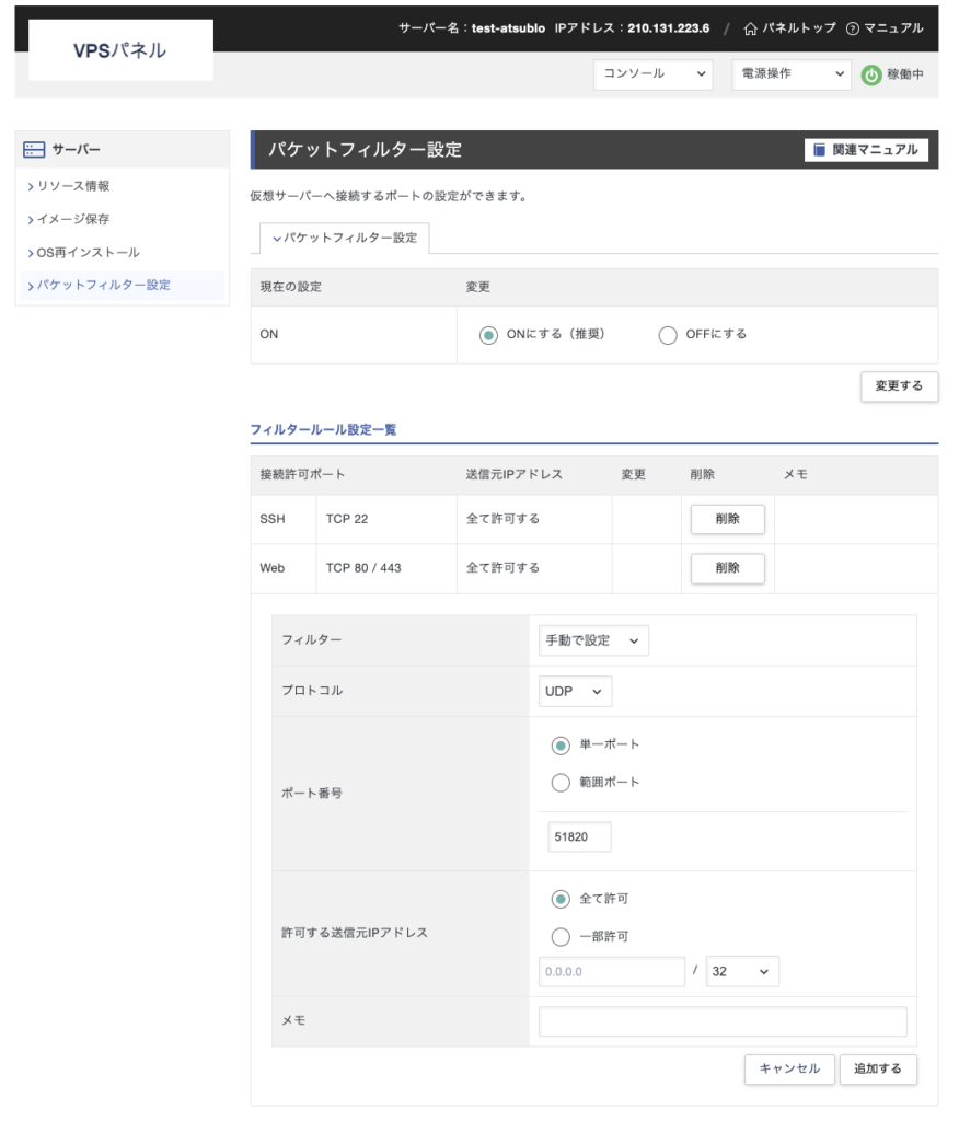 - 「パケットフィルター設定を追加する」をクリックし、以下の2つを追加してください。 (※Webサイト用に80と443の2つを開けます)